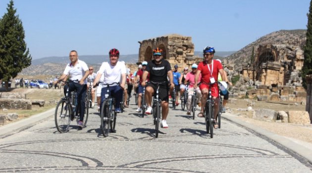 Denizli'nin Pamukkale ilçesinde düzenlenen 2'inci Uluslararası Termal Sağlık Turizm Zirvesi kapsamında 52 ülkeden 300'e yakın katılımcı ve protokol üyeleri, Karahayıt'tan başlayarak, Antik Havuza kadar bisikletlerle 7 kilometrelik etabı tamamladı. İlk olarak, Karahayı'tan şifalı suların bulunduğu alana bisikletle giden katılımcılar, burada dinlendikten sonra Hierapolis Antik kenti içerisinden geçerek, antik havuzun bulunduğu alana gitti. Yolda zaman zaman zorluklar yaşayan katılımcılar, yolda renkli görüntülere sahne oldu. Katılımcılar keyifli bisiklet turunun ardından antik havuzun girişinde hatıra fotoğrafı çektirdi. 5 gün sürecek zirvenin ilk günde düzenlenen bisiklet turuna AK Parti Denizli Milletvekili Şahin Tin, Büyükşehir Belediye Başkanı Osman Zolan, Pamukkale Belediye Başkanı Hüseyin Gürlesin, 52 ülkeden gelen yaklaşık 300 katılımcı katıldı.