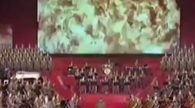 Askeri bir orkestranın arka planında gösterilen videoyu, içlerinden Kuzey Kore lideri Kim Jong-un'un da bulunduğu üst düzey devlet yetkilileri izliyor.
