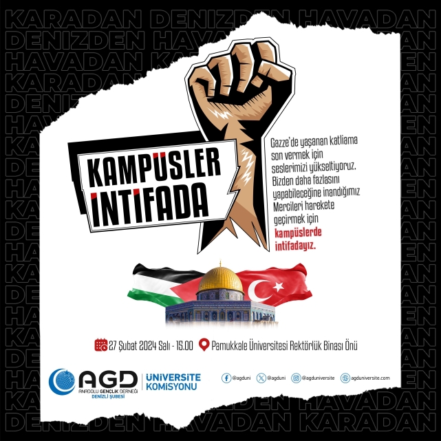 Anadolu Gençlik Derneği Denizli Şubesi Üniversite Komisyonu Bugün Saat:15:00'te Pamukkale Üniversitesi rektörlüğü önünde siyonist İsrail'in Filistin'de uyguladığı vahşet ve katliama karşı yetkili mercileri harekete geçirmek için kampüslerde intifadayız eylemi ve basın açıklamasnı gerçekleştireceğini duyurdu. GÜNDEM