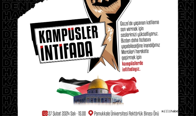 Anadolu Gençlik Derneği Denizli Şubesi Üniversite Komisyonu Bugün Saat:15:00'te Pamukkale Üniversitesi rektörlüğü önünde siyonist İsrail'in Filistin'de uyguladığı vahşet ve katliama karşı yetkili mercileri harekete geçirmek için kampüslerde intifadayız eylemi ve basın açıklamasnı gerçekleştireceğini duyurdu.