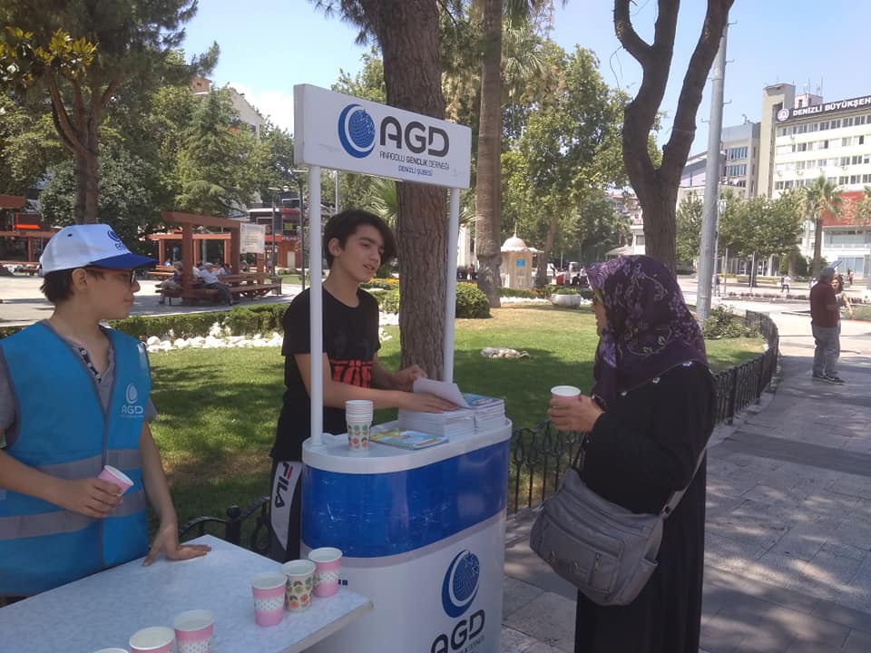 Anadolu Gençlik Derneği Denizli Şubesi Ortaokul Komisyonu tarafından Sosyal farkındalık etkinlikleri kapsamında İstiklal Caddesi üzerine stand kurularak, sıcak havada insanları bir nebze olsun serinletmek için soğuk su dağıtımı gerçekleştirildi.