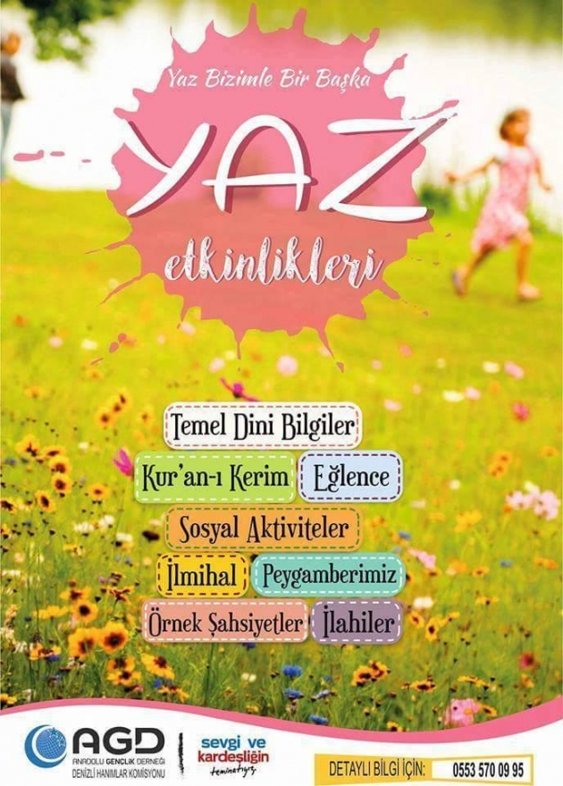 Anadolu Gençlik Derneği Denizli Şubesi Hanımlar Komisyonunun, kız çocuklarının yaz tatilinde ahlaki, manevi, sosyal ve sportif açıdan gelişmelerine katkı sağlamak amacıyla hazırlamış oldukları 2016 Yaz Etkinlikleri programı 11 Temmuz 2016 tarihinde başlıyor.