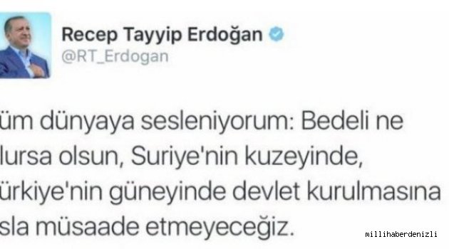 Cumhurbaşkanı Erdoğan, attığı tweet'te "Tüm dünyaya sesleniyorum: Bedeli ne olursa olsun, Suriye'nin kuzeyinde, Türkiye'nin güneyinde devlet kurmalarına asla müsaade etmeyeceğiz."ifadelerine yer vermişti.