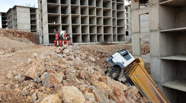 Denizli'de inşaat sahasında yapılan çalışma sırasında kontrolden çıkan kamyon devrildi.
