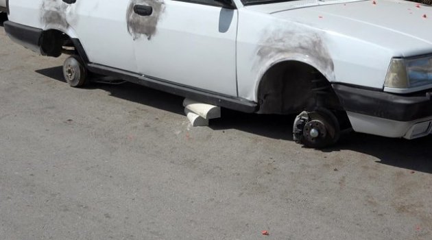 Denizli'de hırsızlar, gece saatlerinde park halindeki otomobilin 4 tekerliğini çaldı.