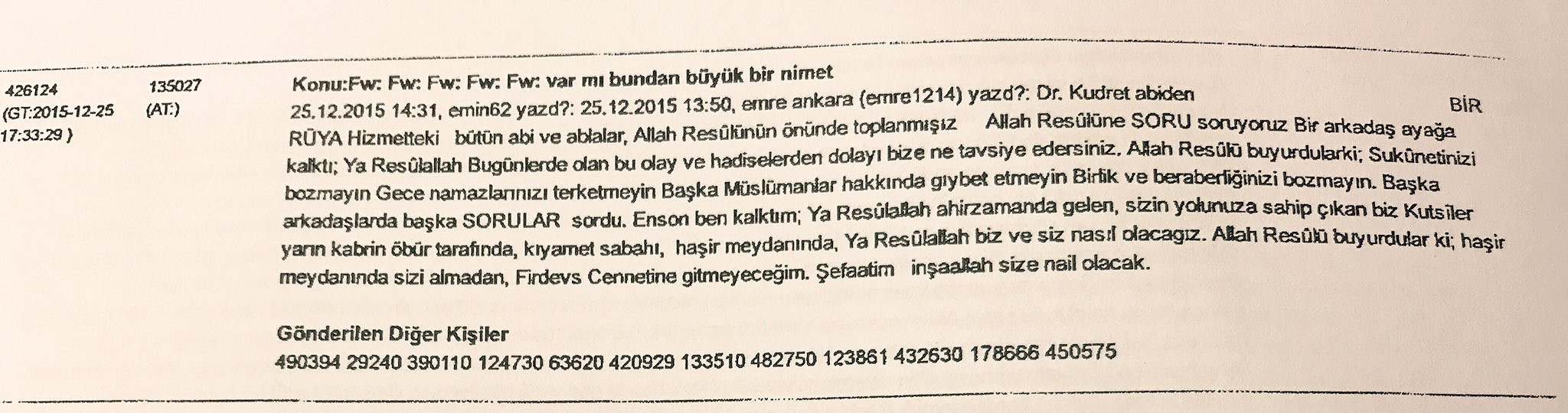 Antalya'da yürütülen FETÖ soruşturması kapsamında ortaya çıkan ByLock yazışmalarında FETÖ'cü simsarların dini değerleri nasıl çirkin bir şekilde kullandığı ortaya çıktı. Yazışmalarda insanların uydurma hikayelerle gaza getirilip yönlendirilmesi dikkat çeken detaylar arasında yer aldı.