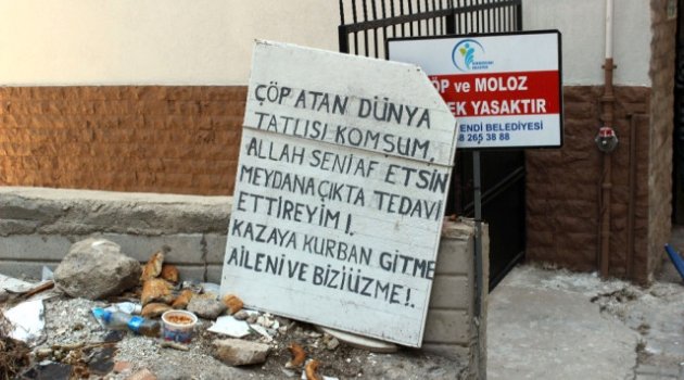 DENİZLİ () – Denizli'de komşularının çöp atmanın yasak olduğu yere çöp atmasına isyan eden vatandaş, "Çöp atan dünya tatlısı komşum. Allah seni affetsin. Meydana çık da tedavi ettireyim. Kazaya kurban gitme, aileni ve bizi üzme" yazdığı pankartı çöp atılan yere koydu.