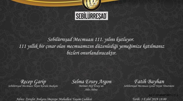 Mehmet Akif Ersoy’un yayımladığı, günümüzde de Ersoy ailesinin katkılarıyla çıkan Sebîlürreşad dergisinin 111. Yıl kutlaması Ankara Ak Plaza’da 3 Eylül akşamı gerçekleştirilecek.