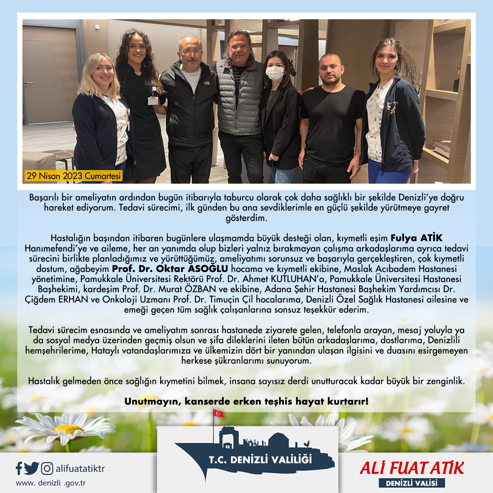 Geçmiş olsun Sayın Vali şehir sizi bekliyor...Kolon kanseri nedeniyle bir süredir tedavi altında olan Denizli Valisi Ali Fuat Atik, başarılı bir ameliyatın ardından bugün taburcu edildi. Vali Atik sosyal medya hesaplarından yaptığı açıklamada "Denizli’ye doğru hareket ediyorum" dedi.