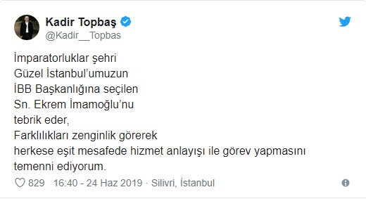 Topbaş paylaşımında, "Sn. Ekrem İmamoğlu'nu tebrik eder, farklılıkları zengin görerek herkese eşit mesafede hizmet anlayışı ile görev yapmasını temenni ediyorum" dedi.