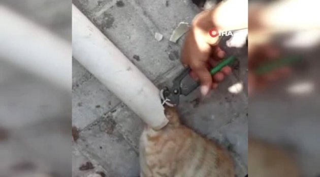 Kafası boruya sıkışan kediyi itfaiye kurtardı