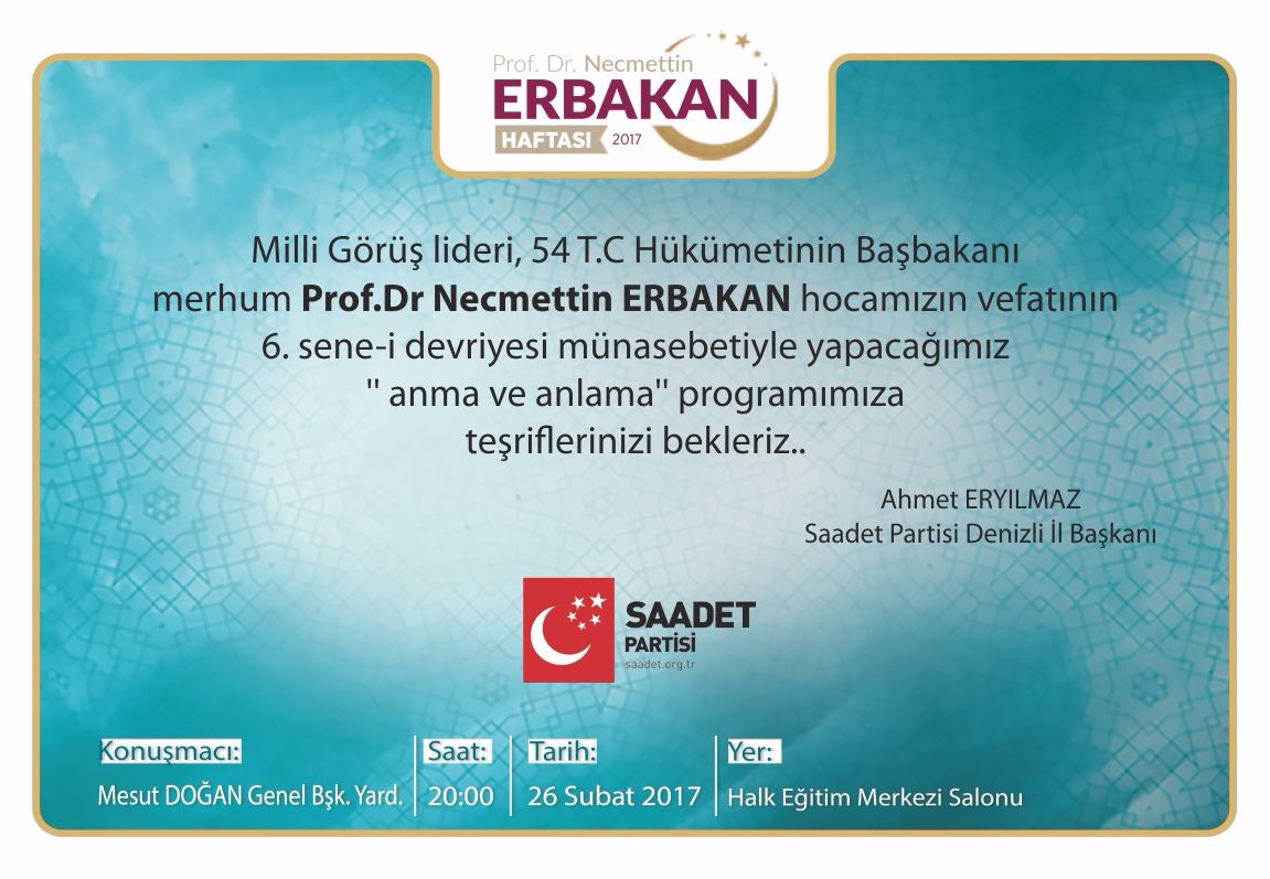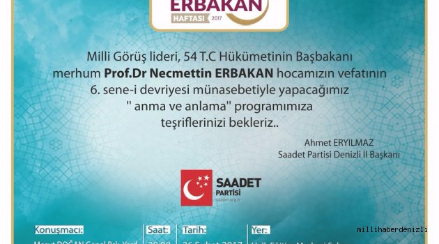 Saadet Partisi Denizli İl Başkanlığı 27 Şubat 2011 'de vefat eden Milli Görüş lideri Prof.Dr Necmettin ERBAKAN Hocayı anma programı düzenliyor.