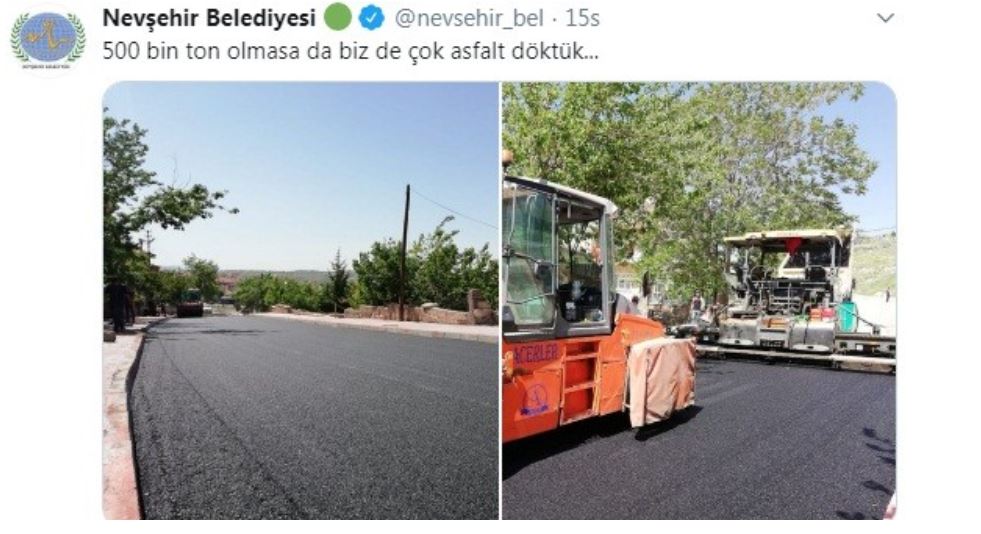 Nevşehir Belediyesi, sosyal medya hesabından yaptığı paylaşımda, '500 bin ton olmasa da biz de çok asfalt döktük...' ifadelerini kullandı.