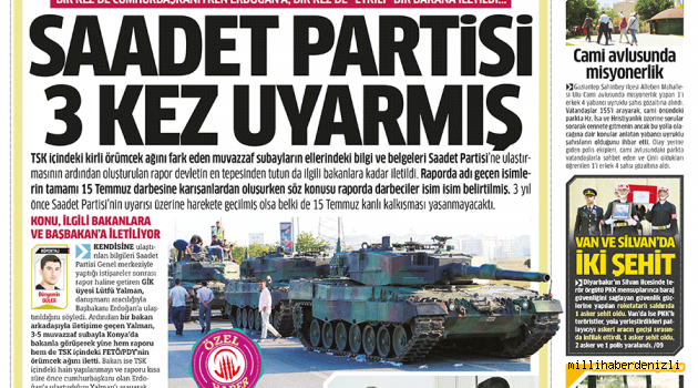 içindeki kirli örümcek ağını fark eden muvazzaf subayların ellerindeki bilgi ve belgeleri Saadet Partisi’ne ulaştırmasının ardından oluşturulan rapor devletin en tepesinden tutun da ilgili bakanlara kadar iletildi. Raporda adı geçen isimlerin tamamı 15 Temmuz darbesine karışanlardan oluşurken söz konusu raporda darbeciler isim isim belirtilmiş. 3 yıl önce Saadet Partisi’nin uyarısı üzerine harekete geçilmiş olsa belki de 15 Temmuz kanlı kalkışması yaşanmayacaktı.