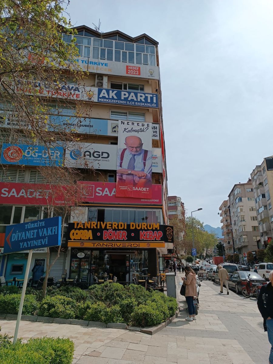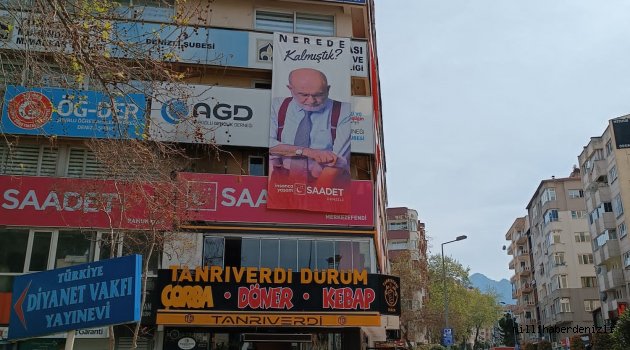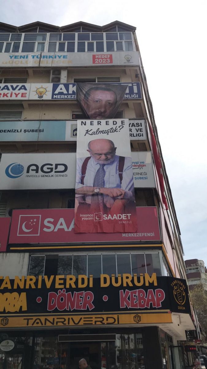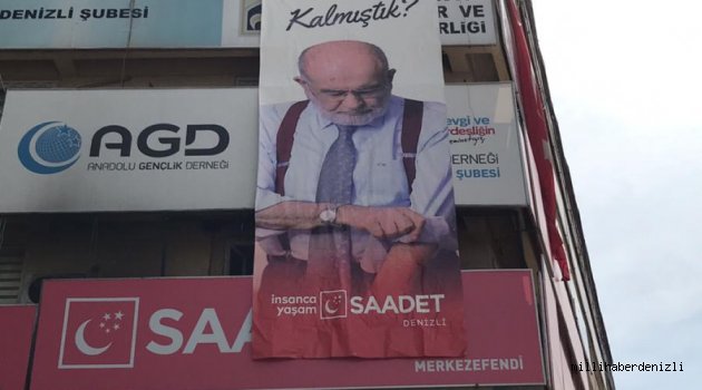 Saadet Partisi Denizli İl Başkanlığı parti penceresinden dış cepheye Saadet Partisi Genel Başkanı Temel Karamollaoğlu'nun "Nerede Kalmıştık" yazan posterini astı.