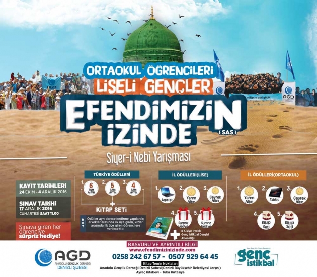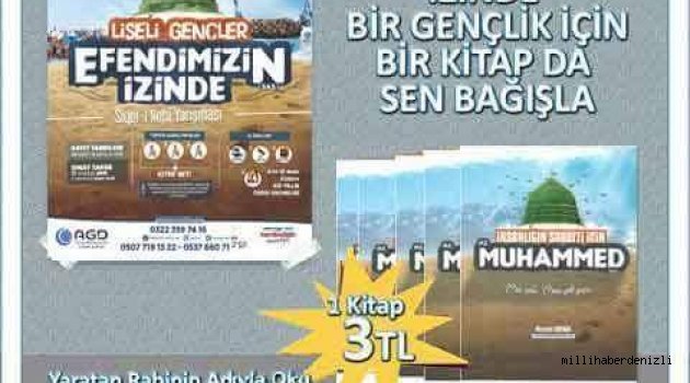 ANADOLU GENÇLİK DERNEĞİ (MİLLİ GENÇLİK VAKFI ) DENİZLİ ŞUBESİ SİYER-İ NEBİ YARIŞMASINDA ORTAOKUL VE LİSELİ ÖĞRENCİLERİMİZE VERECEĞİMİZ KİTAPLARA SPONSORLAR ARIYOR.BU HAYRA ORTAK OLUN. BİZ KİTAP MEDENİYETİNİN EVLATLARİYİZ.UNUTMAYIN ! ALLAH(c.c) YOLUNDA VERMEK, İNFAK ETMEK MALI EKSİLTMEZ ARTIRIR BEREKETLENDİRİR. Resulullah (sav) buyurdu ki" Bütün ibadetlere verilen sevap, Allah yolunda cihada verilen sevaba göre, deniz yanında bir damla su gibidir. Cihad sevabı da, emr-i maruf ve nehy-i anil münker [dinin emir ve yasaklarını herhangi bir şekilde yaymaya çalışma]sevabı yanında, denize nispetle bir damla su gibidir.) "