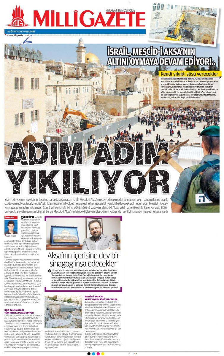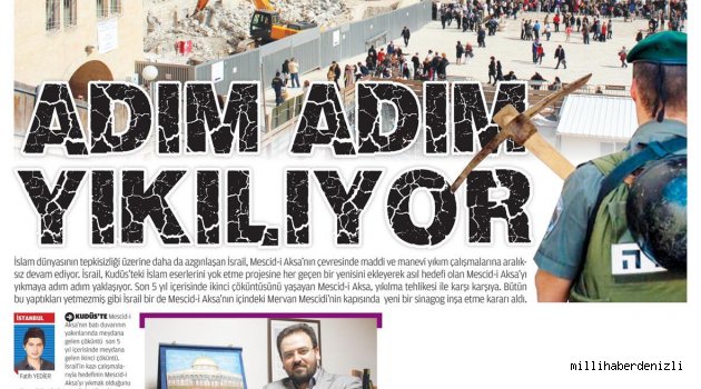 İslam dünyasının tepkisizliği üzerine daha da azgınlaşan İsrail, Mescid-i Aksa'nın çevresinde maddi ve manevi yıkım çalışmalarına aralıksız devam ediyor. İsrail, Kudüs'teki İslam eserlerini yok etme projesine her geçen bir yenisini ekleyerek asıl hedefi olan Mescid-i Aksa’yı yıkmaya adım adım yaklaşıyor. Son 5 yıl içerisinde ikinci çöküntüsünü yaşayan Mescid-i Aksa, yıkılma tehlikesi ile karşı karşıya. Bütün bu yaptıkları yetmezmiş gibi İsrail bir de Mescid-i Aksa’nın kapısında yeni bir sinagog inşa etme kararı aldı.
