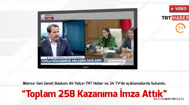 TRT Haber ve 24 TV'den konuşan Memur-Sen Genel Başkanı Ali Yalçın, 4.Dönem Toplu Sözleşmesi’nde toplam 258 kazanım elde ettiklerini ifade ederek, “Memur-Sen, akademik hizmet sendikacılığı, göl kenarında nehir düşleyen aksiyoner duruş sendikacılığı, insan merkezli ve çözüm odaklı sendikacılığı noktasında çıtayı, bir çokları açısından ulaşılması imkansız bir noktaya çıkarmıştır” dedi.