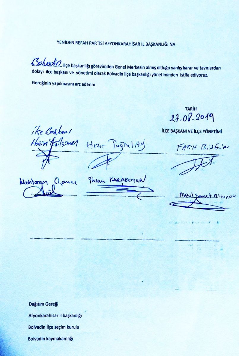 İl başkanımıza ve il yönetimine yapılan bu uygulamayı haksız bulduğumuz için ilçe başkanlığı görevimizden istifa ediyoruz.